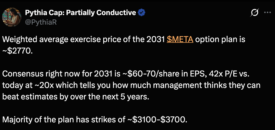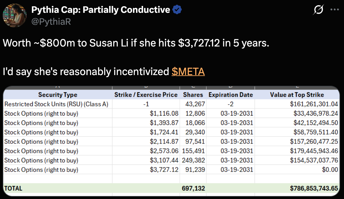 The option plan’s strikes are extremely high, ~$2770 on average, which implies a 31% CAGR from current levels shows internal confidence on levels I haven’t seen before. Additionally, Meta’s CFO, Susan Li, is strongly incentivized to drive even more extreme returns for the company: