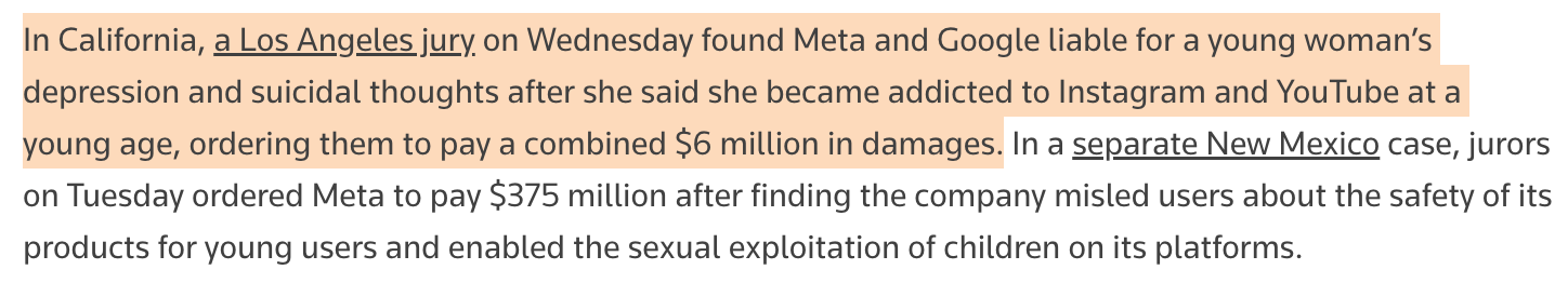 Will Meta be forced to make their platforms less addictive? Removing the endless scroll, curated feeds, and targeted advertising would certainly harm their business.