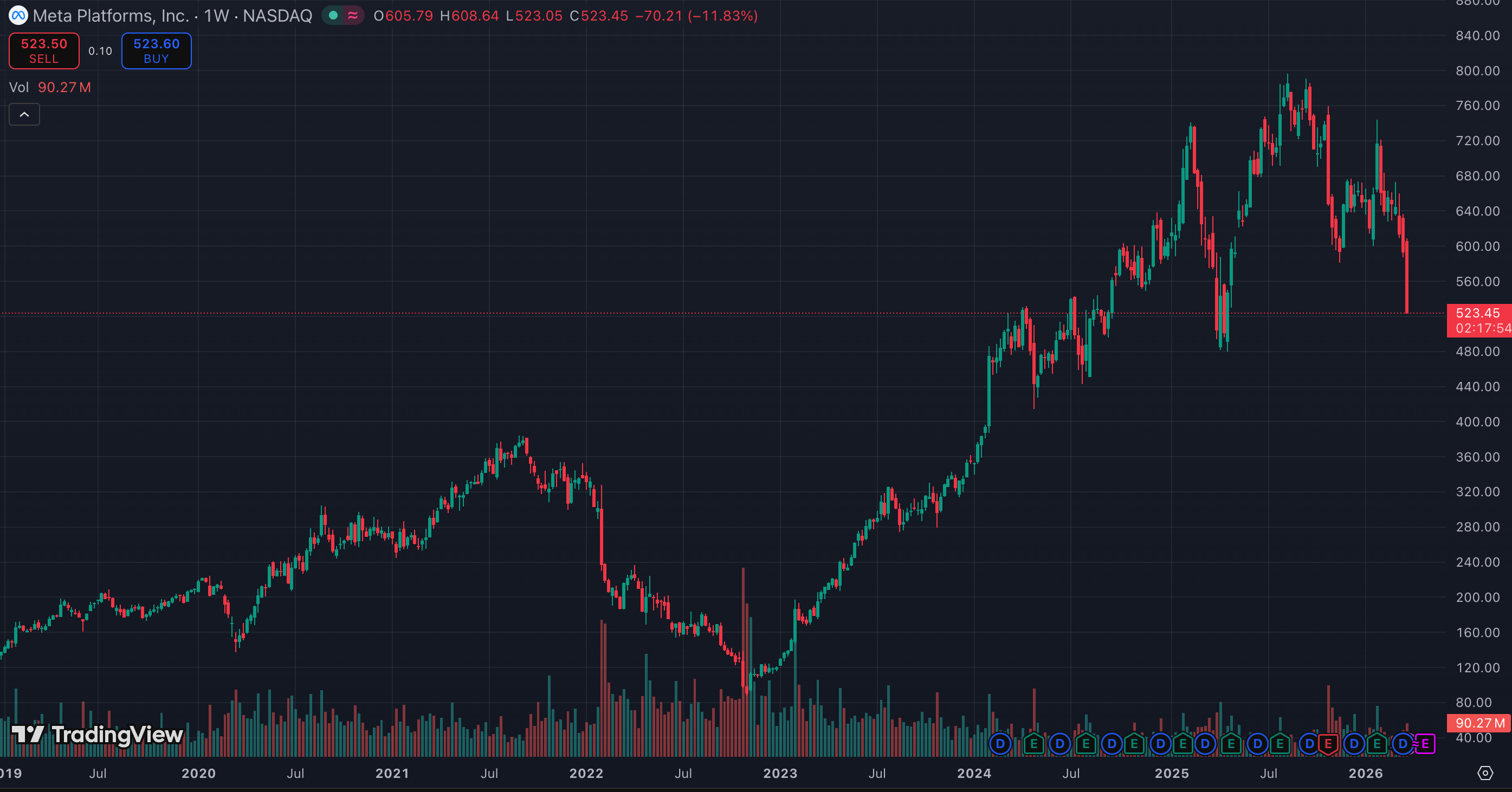 Meta joined other mag-7 companies in 2026, projecting massive capital expenditures on AI of $115-135b in FY26. This announcement was made in the Q4 2025 earnings report on January 28, 2026, and the stock is down ~30% since.