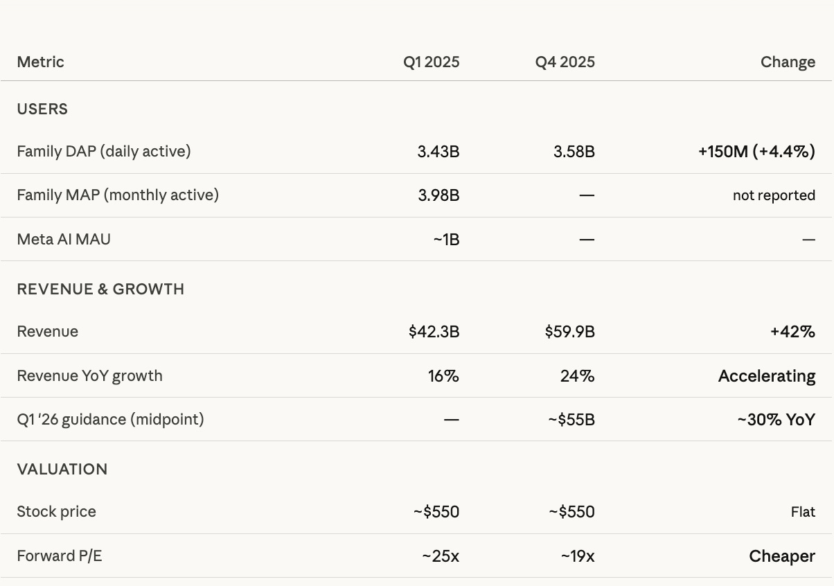 $META is back below $550 ($525 at the time of writing this) for the first time since the April tariff scares of last year — despite significant financial improvement since then: