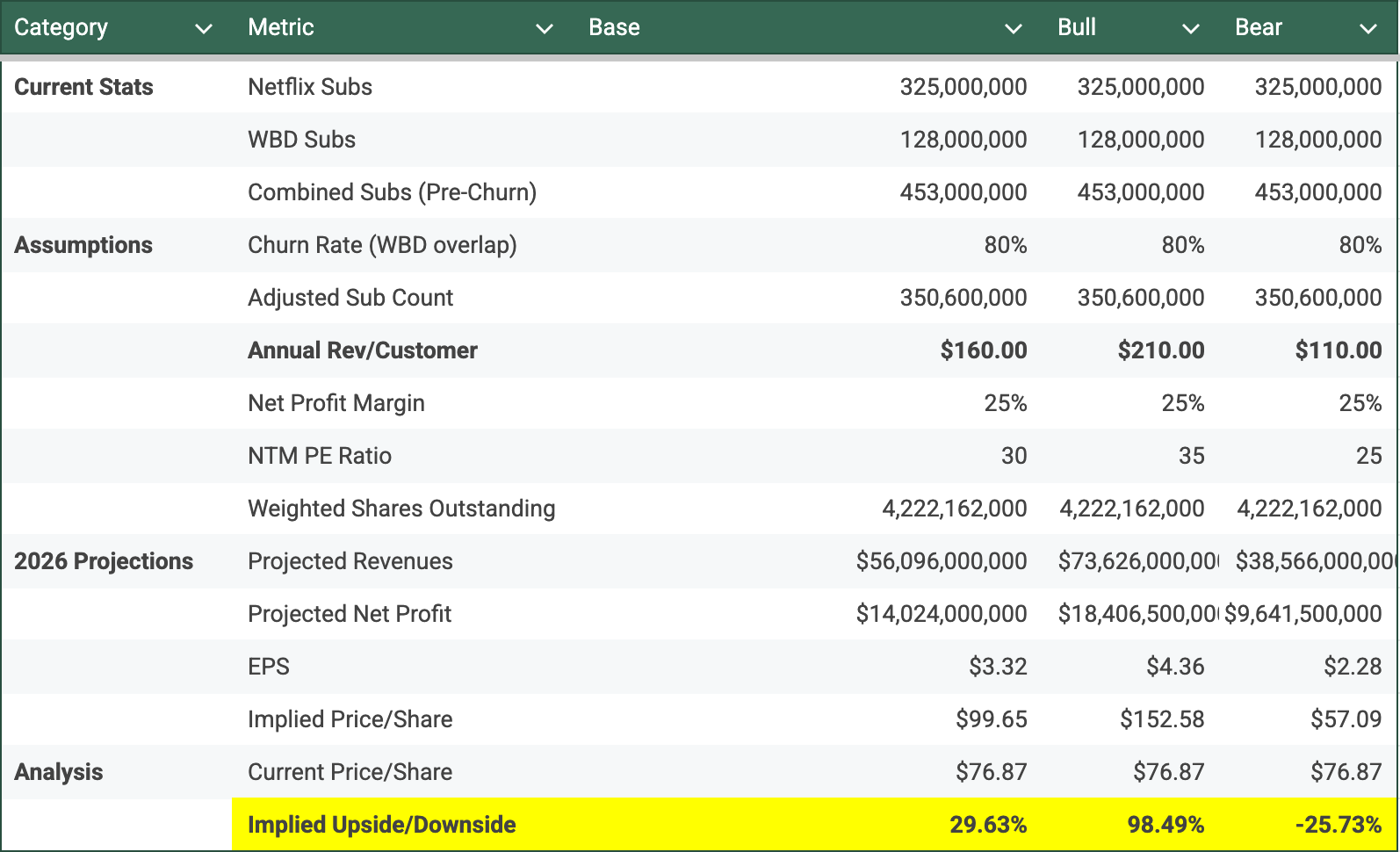Net Profit Margin I assumed to be stable because Netflix has operated in the streaming business for years and I don’t expect that this acquisition will materially affect costs.