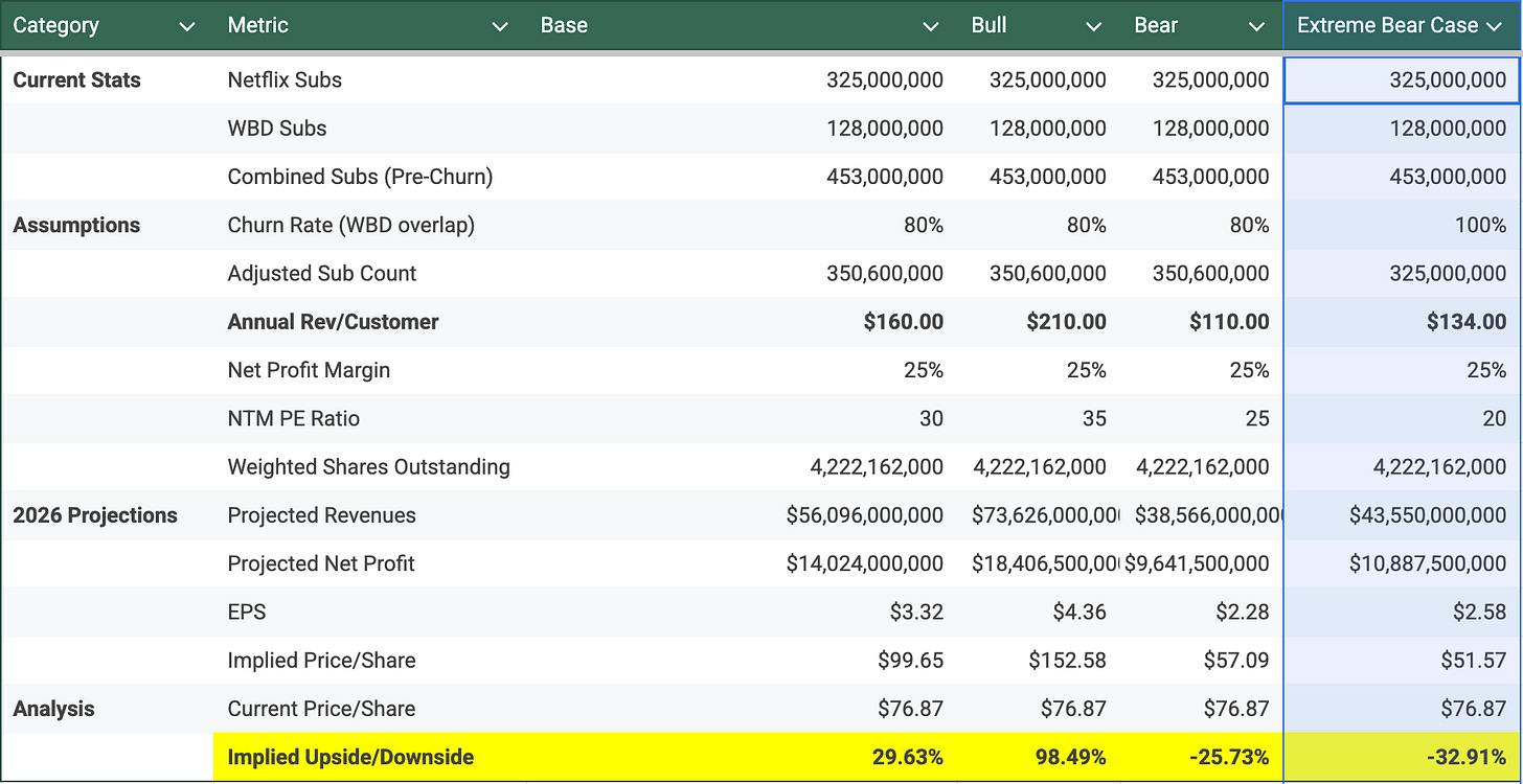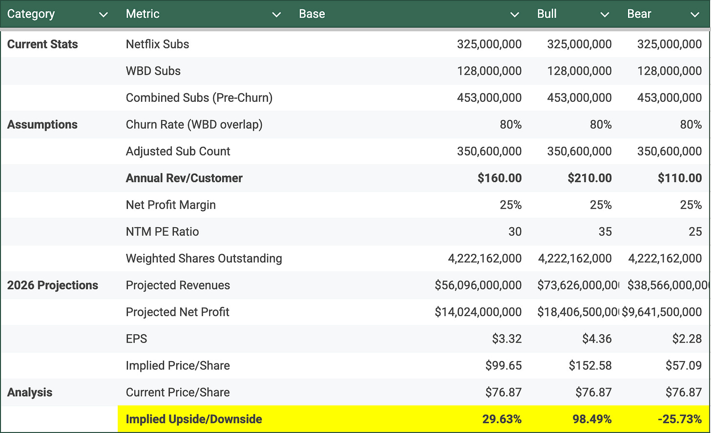 Annual Rev/Customer is where I think this trade comes to life. If you average out the annual rev/customer from Netflix ($134) and WBD ($85) you get ~$110. I put this as the bear case to be conservative, but I think it’s highly unlikely that Netflix doesn’t raise prices if this deal goes through.