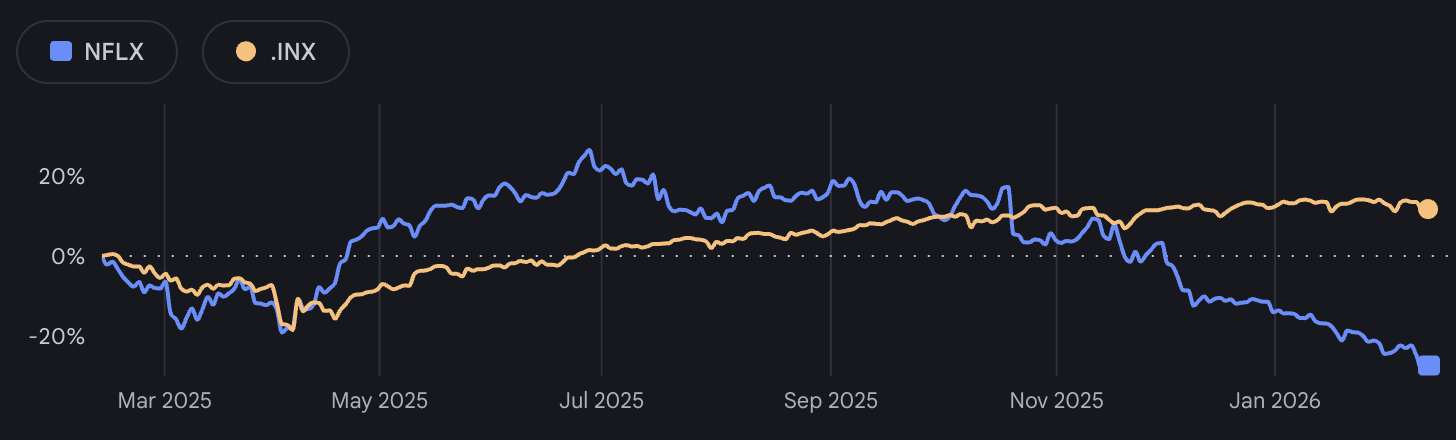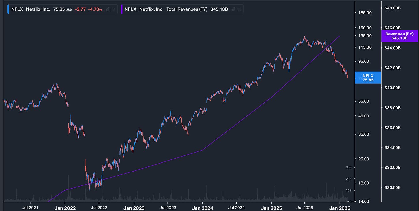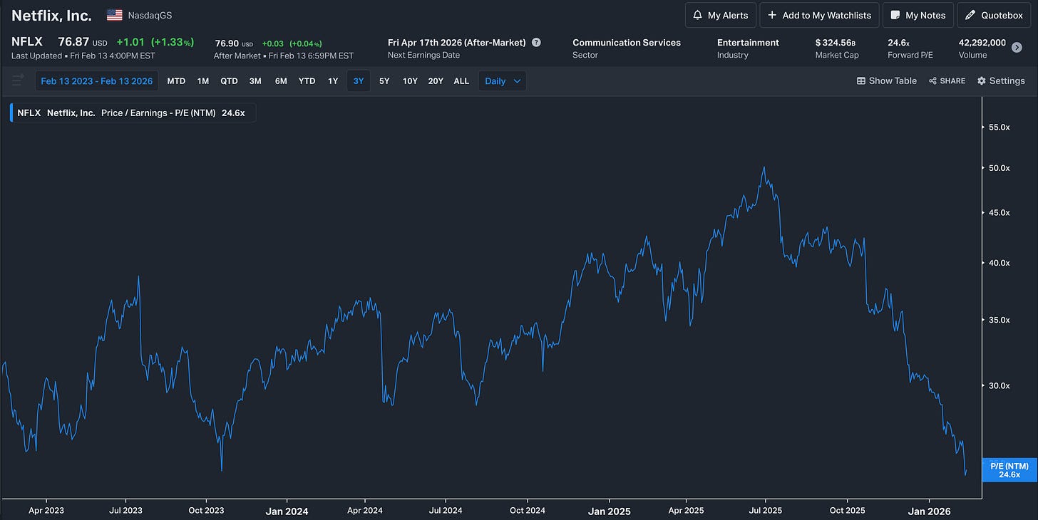 NFLX 0.00%↑ has sold off quite a bit, down over 40% from its 52wk high of $134.12. It’s now trading at a 3 year low PE ratio of 24x NTM earnings. I think the reason for the sell off is primarily concern over the acquisition of WBD 0.00%↑ and the uncertainty regarding that. You can see that NFLX 0.00%↑ diverges from the broader market in early December of 2025, right when the acquisition was announced.