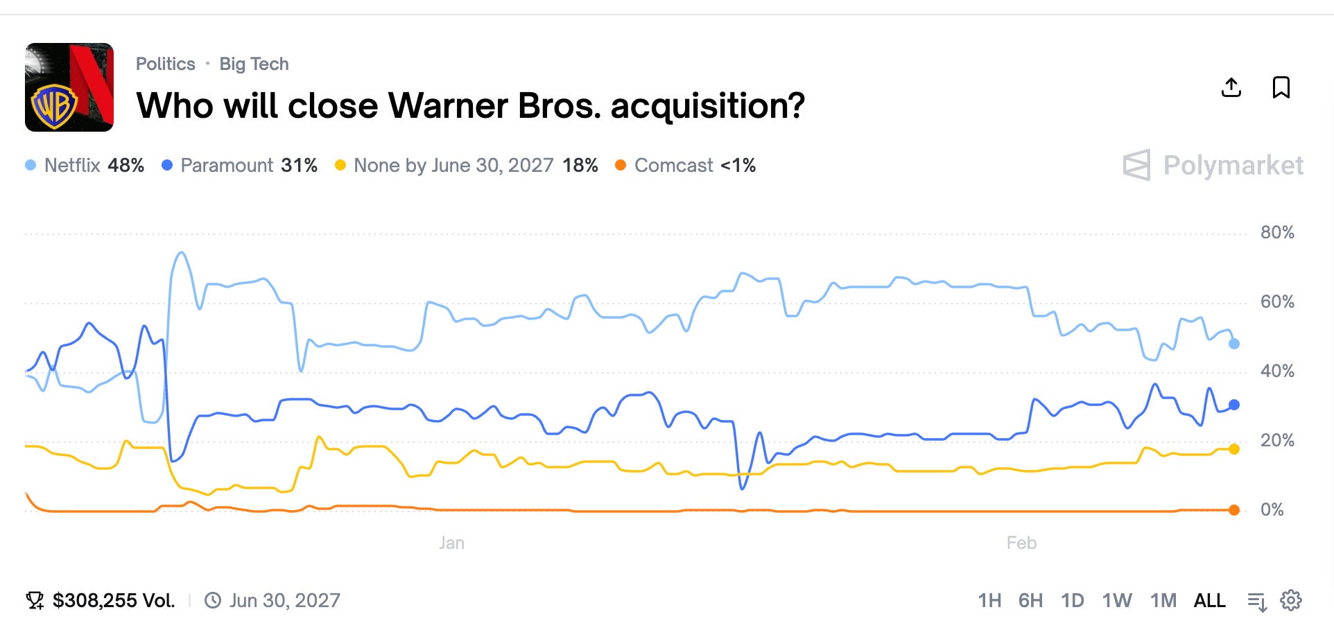 It is important to note that while I believe the acquisition will go through, traders on Polymarket have the odds at only ~50% that Netflix will be the company to acquire Warner Bros by mid-2027.