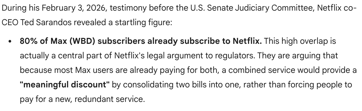 Churn Rate (WBD Overlap) refers to the amount of WBD users who already have a Netflix sub. This figure is from Netflix themselves, and is part of their legal argument to regulators. More below: