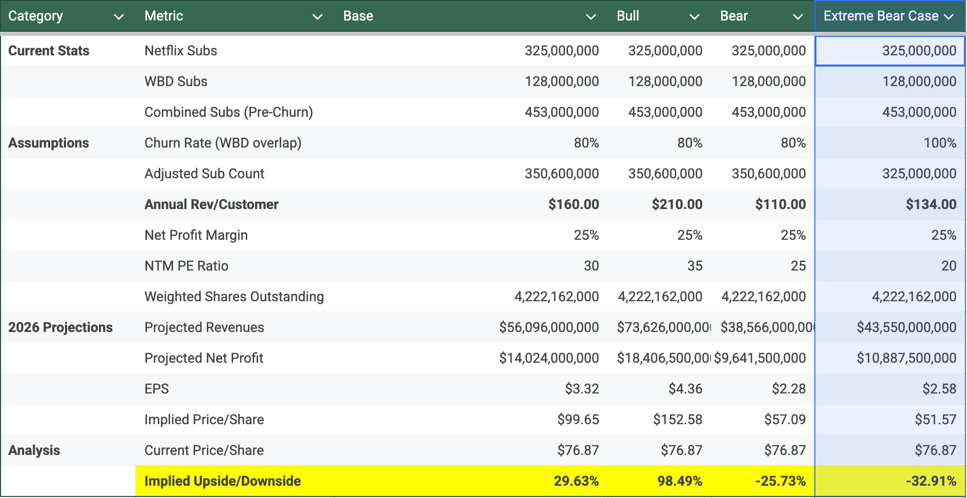 In this extreme bear case, share price falls from $76.87 to $51.57, a 32.91% loss. This is driven by no subscriber growth, acquisition not going through, and average revenue per user staying flat. I think the likelihood of this scenario is exceedingly low, but I thought it could be worthwhile just to show what that might look like.