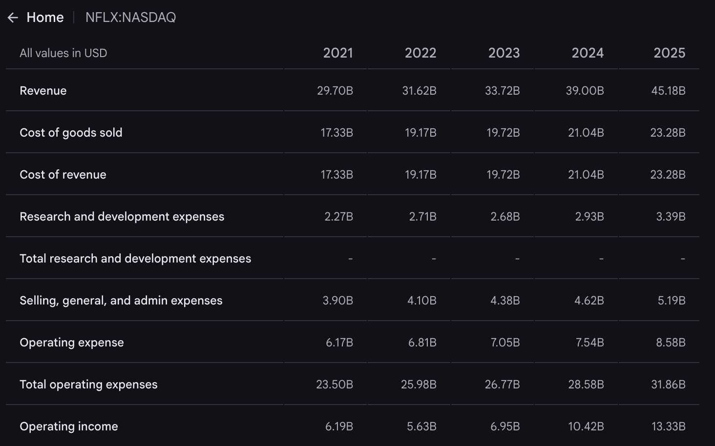 From 2021 to 2025, operating margins have gone from 20.8% to 29.5% respectively, signifying that NFLX 0.00%↑ has been able to keep costs under control while ramping up revenues. Given that their levers to pull in terms of revenue drivers are increasing subscription costs + event-style content, this makes sense intuitively.