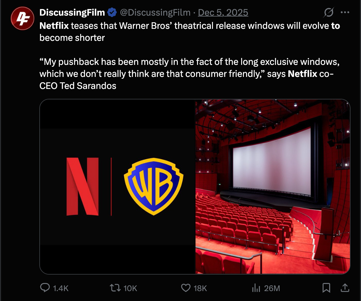 If Netflix can actually make this happen, especially with DC Studios as part of their library, I think this would drive a lot more revenue to them. From a unit economics perspective, the movie theater experience (~$20/ticket, family of four so ~$80 in tickets + $15-25 in terms of snacks/candy) is much more expensive than the $20-25/month streaming costs. If movies hit streaming within a few weeks of being released I think Netflix could really take market share from in-person moviegoers.