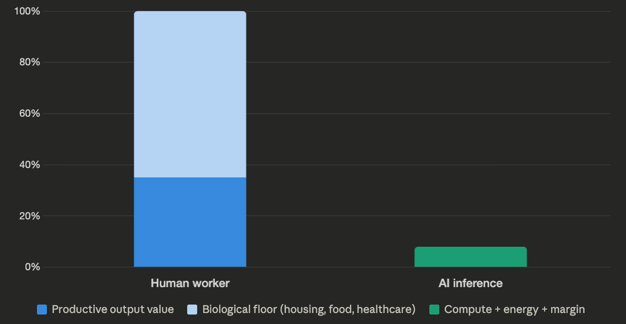 The third point is probably the most defensible. When you pay an employee a market rate, that rate has a biological floor — it has to cover housing, food, healthcare, and everything else a human needs to survive. That floor props up labor costs across the board, regardless of the actual productive output of the worker. Inference has no such floor. The cost of a unit of AI labor is compute, energy, and a margin to the model provider — and all three are deflationary over time. When you remove the biological floor from the cost of cognitive work, margins expand structurally, and every company will be pressured by shareholders and basic capitalism to exploit that gap.