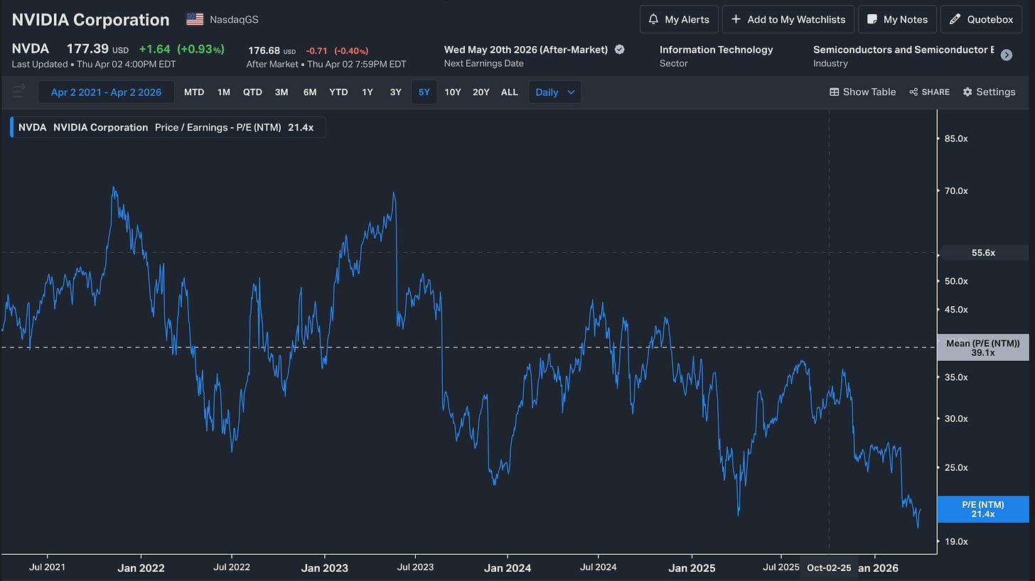 Despite Q1 FY26 guidance of $78 billion, an over 70% YoY growth, NVDA’s forward price-to-earnings multiple has contracted to ~21.4x.