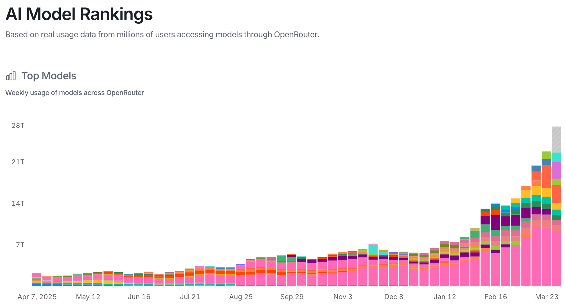 In roughly a year, weekly token usage has gone from ~2.18T tokens to ~22.6T tokens. I only expect this to grow in the near term, especially as large companies are pressured to reduce headcount — inference demand will grow as companies downsize.