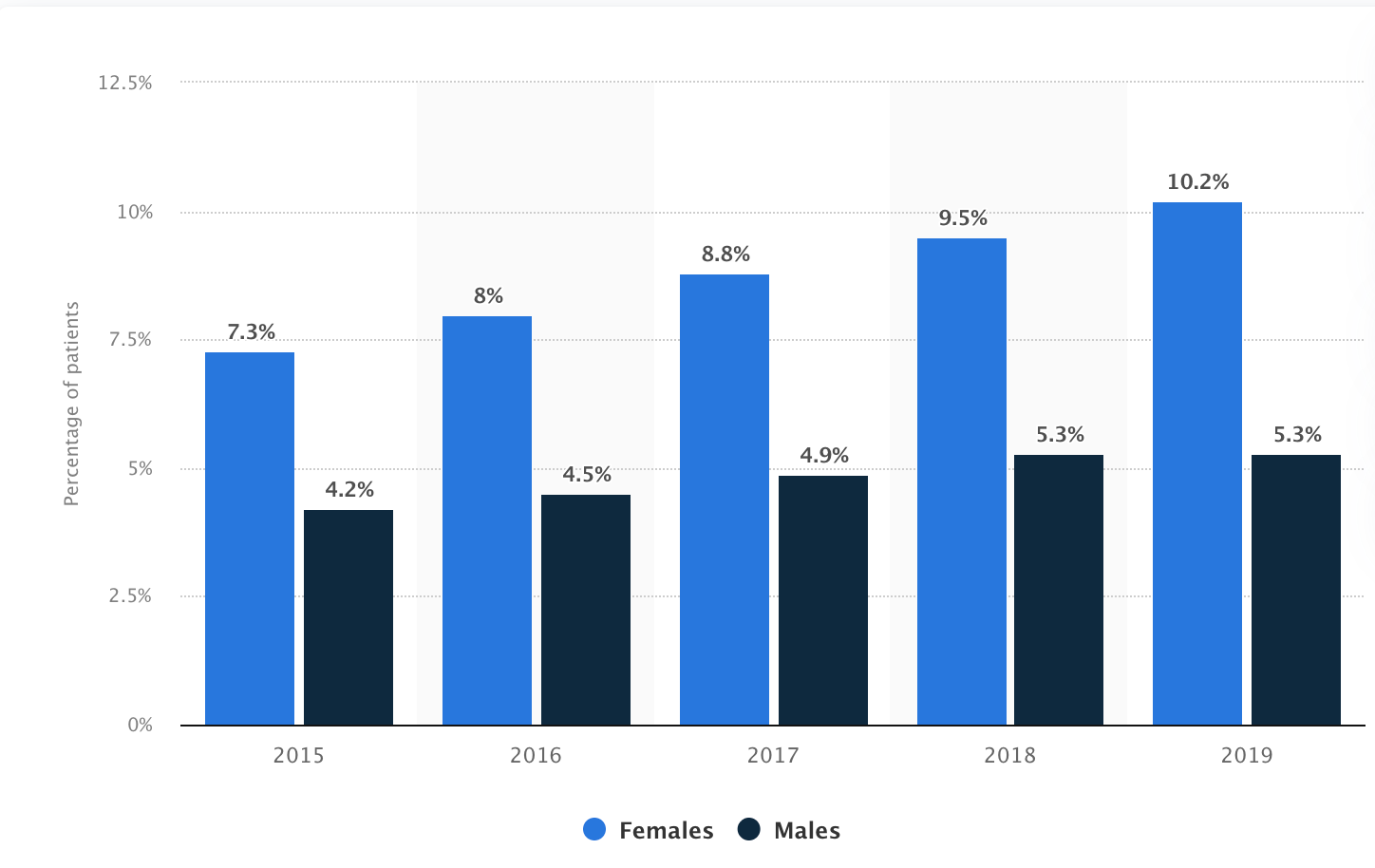 With our attention spans rapidly decreasing, I’ve noticed an increased amount of stimulant/antidepressant prescriptions to my classmates, friends, and my generation as a whole. This is backed by scientific research and is a seriously concerning development as many of my generation, including myself in many regards, are choosing short-term dopamine over delayed gratification. Below is a chart of the percentage of teenagers in the United States taking antidepressants from 2015 to 2019, by gender. This study was carried out in 2020 and I fear that the real figure stands much higher today, as short form content has only been around since roughly August of 2018.